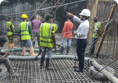 Through BNBC-aligned designs, QA/QC checklists, on-site supervision, method statements, and safety audits throughout the project lifecycle.